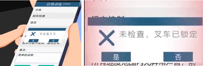 Employees need to complete the appearance inspection, operation inspection, brake inspection, etc. according to the prompts of the APP, and if the inspection is not completed according to the prompts, the forklift will not be able to start.